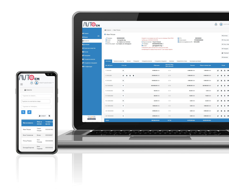 Договори, превозни средства, вноски, плащания,автоматични подсещания през SMS/Viber, специални плащания, допълнителни уговорки, промени по договор и други